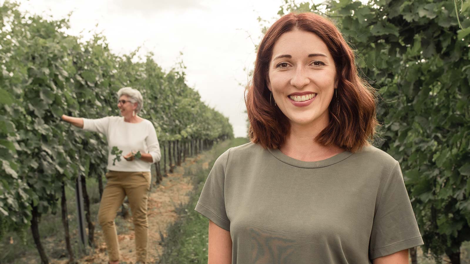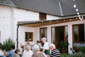 Maria Faber-Köchl bedient Gäste im Hof des Weingut Faber-Köchl