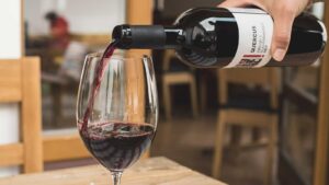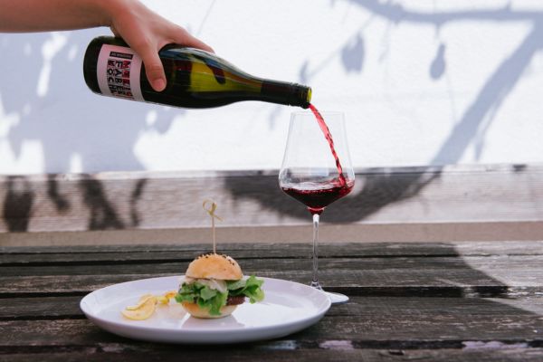 Blunzn-Burger mit einem Glas Rotwein, das gerade eingeschenkt wird