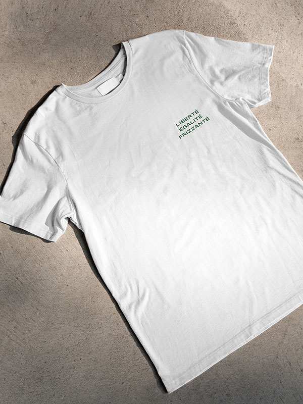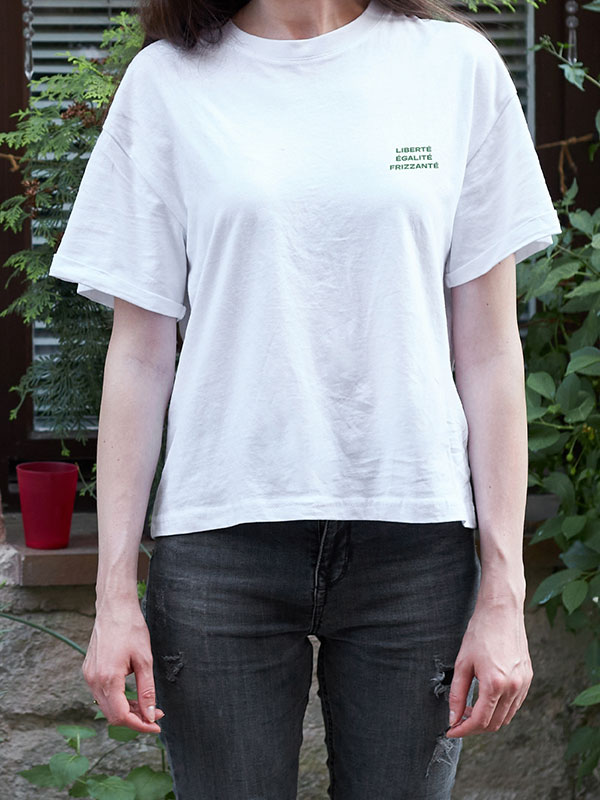 Fair produziertes T-Shirt mit Aufschrift “Liberté, Égalité, Frizzanté”. 100% aus Bio-Baumwolle. Lockere Passform. Unisex. Rundausschnitt.
